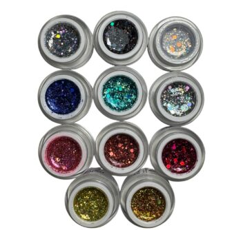 Mitte valguva koostisega geel, mille sees on erineva suuruste ja kujukestega glitter tükikesed. Võimaldab luua erinevaid isikupäraseid disaine. Kata küüs geeliga kasvõi üle terve küüne või kasuta mõne muu disaini loomiseks. Lihtne peale kanda.
